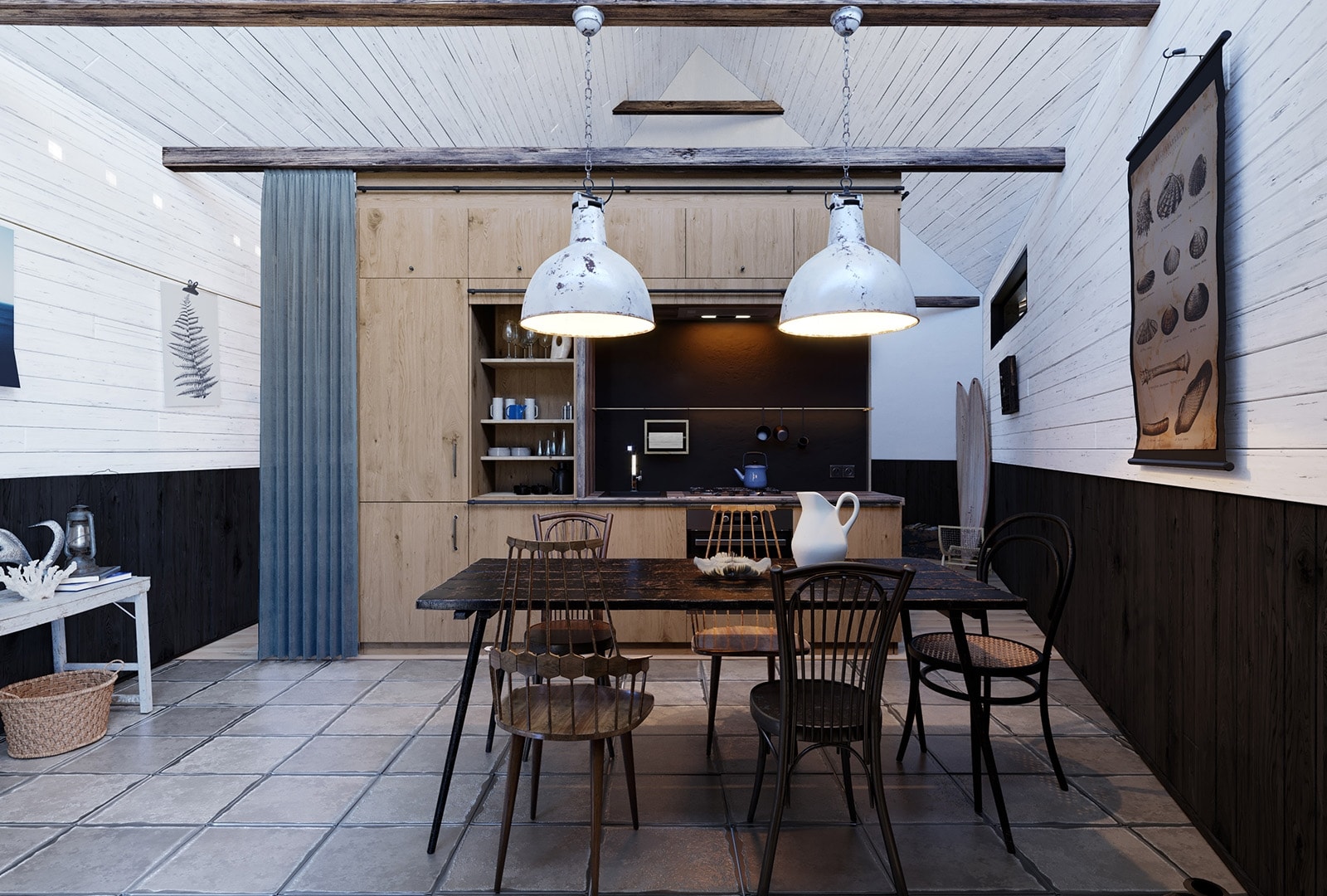 Wnętrze z uwagi na swoje niewielkie rozmiary zorganizowane jest kompaktowo. Centralną część stanowi rdzeń w formie prostopadłościanu, w którym zawarto łazienkę, zabudowę kuchenną, miejsce pracy oraz miejsca przechowywania. Na nim, w obrębie poddasza, zlokalizowano łóżka. Poza tym zaprojektowano jadalnię i część wypoczynkową z przeszklonym wykuszem. Charakter wnętrza jest utrzymany w stylu nowoczesno - rustykalnym.